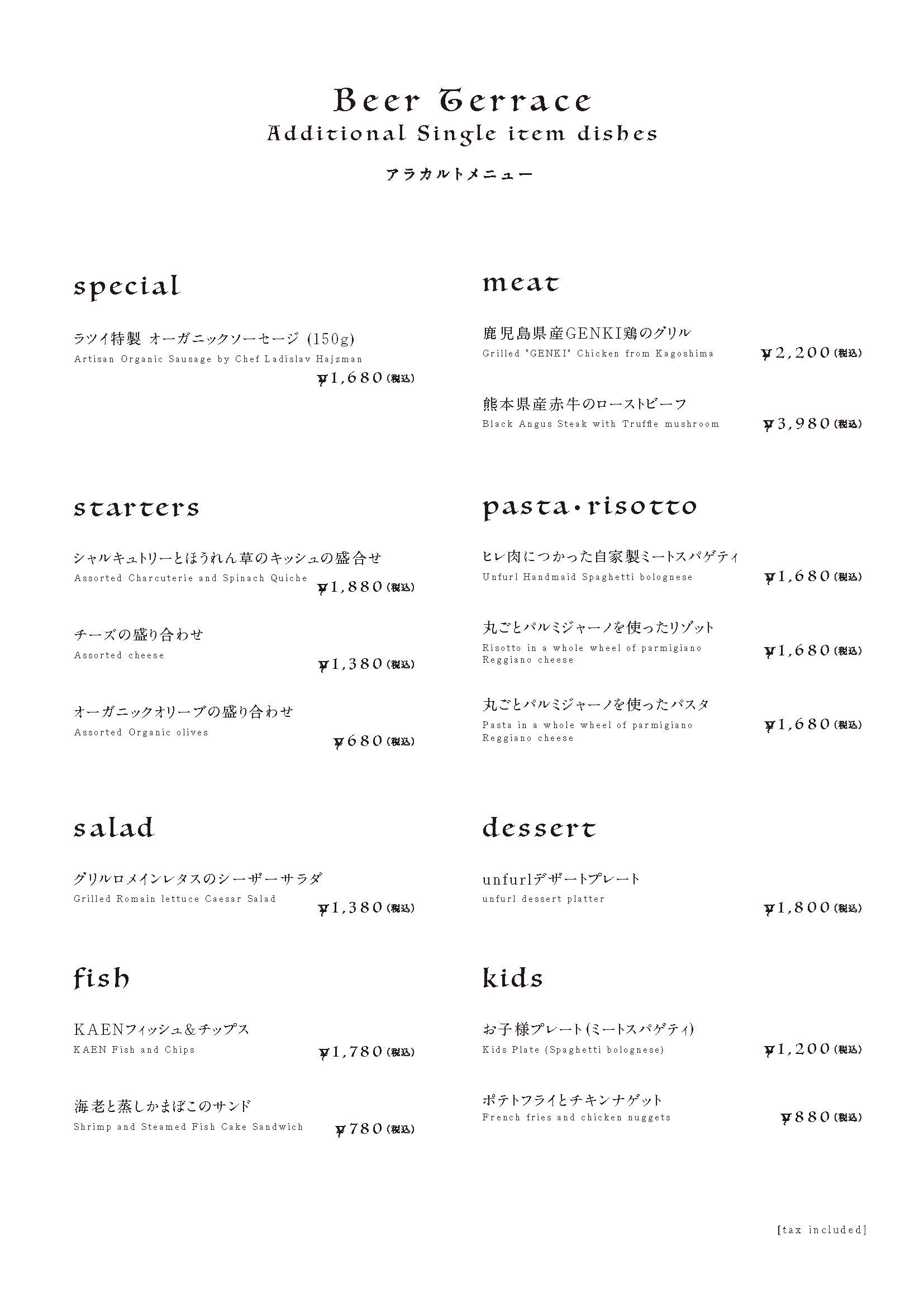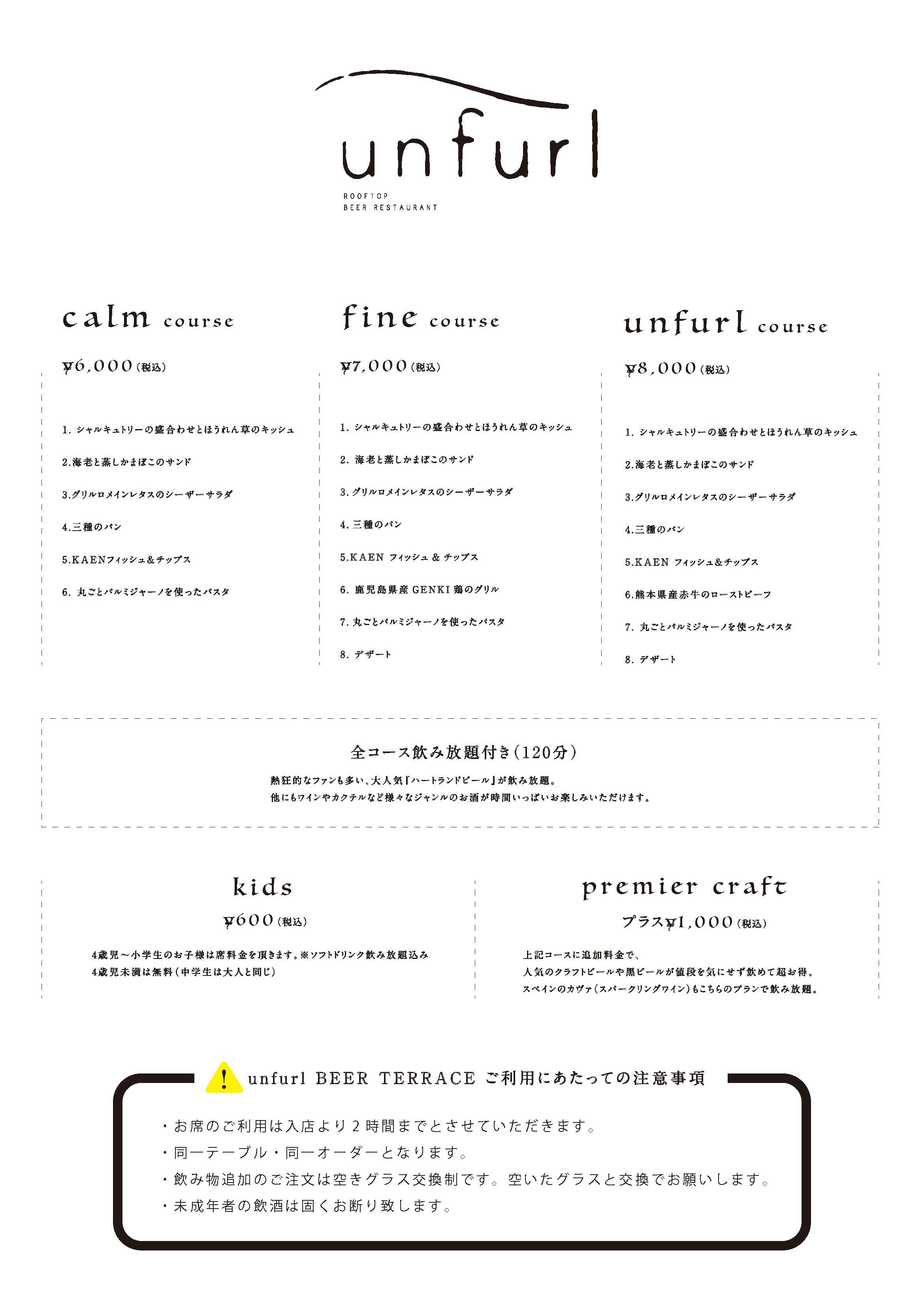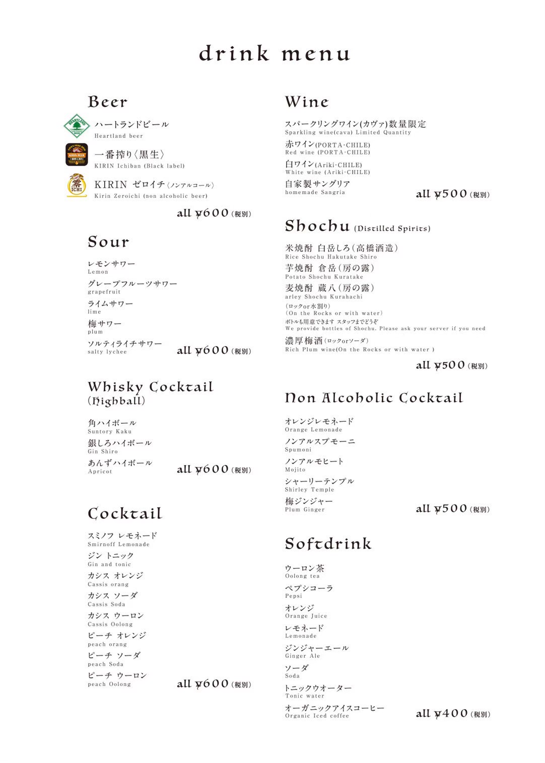 Menu MenuFood&Drink オープンテラスで楽しめるディナーメニューを厳選して提供しております!飲み放題付コースは4000円・5500円(税抜)の2種類ご用意しております。ご予算に応じてお選び下さい。当日来店のみ単品注文可能です。 Course Food Drink
